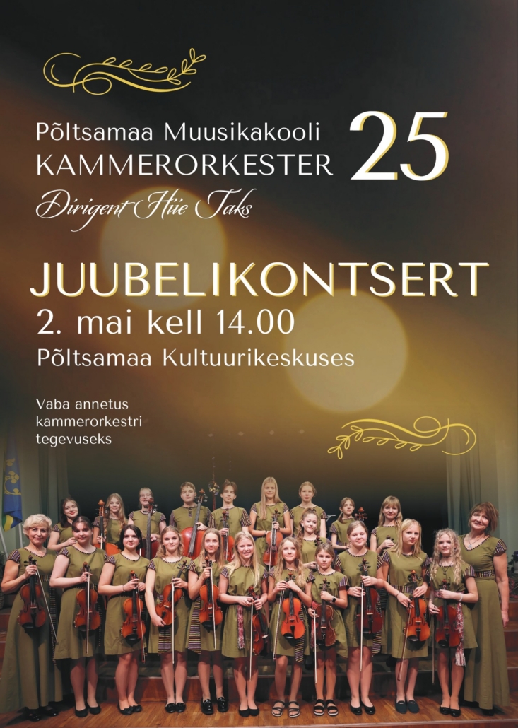 Põltsamaa Muusikakooli Kammerorkester 25 Põltsamaa Muusikakooli Kammerorkester 25 Dirigent Hiie Taks. Vaba annetus kammerorkestri tegevuseks. ... 02 mai 14:00