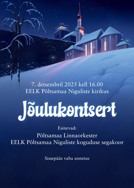 EELK Põltsamaa Niguliste kirikus ADVENDIKONTSERT 7. detsembril 2025 kell 16.00 Esinevad: Põltsamaa Linnaorkester ja EELK Põltsamaa Niguliste koguduse segakoor 00 päeva 00 tundi 00 minutit 00 sekundit Kuupäev 07 dets. 2025 Aeg 16:00 - 18:00 Jaga