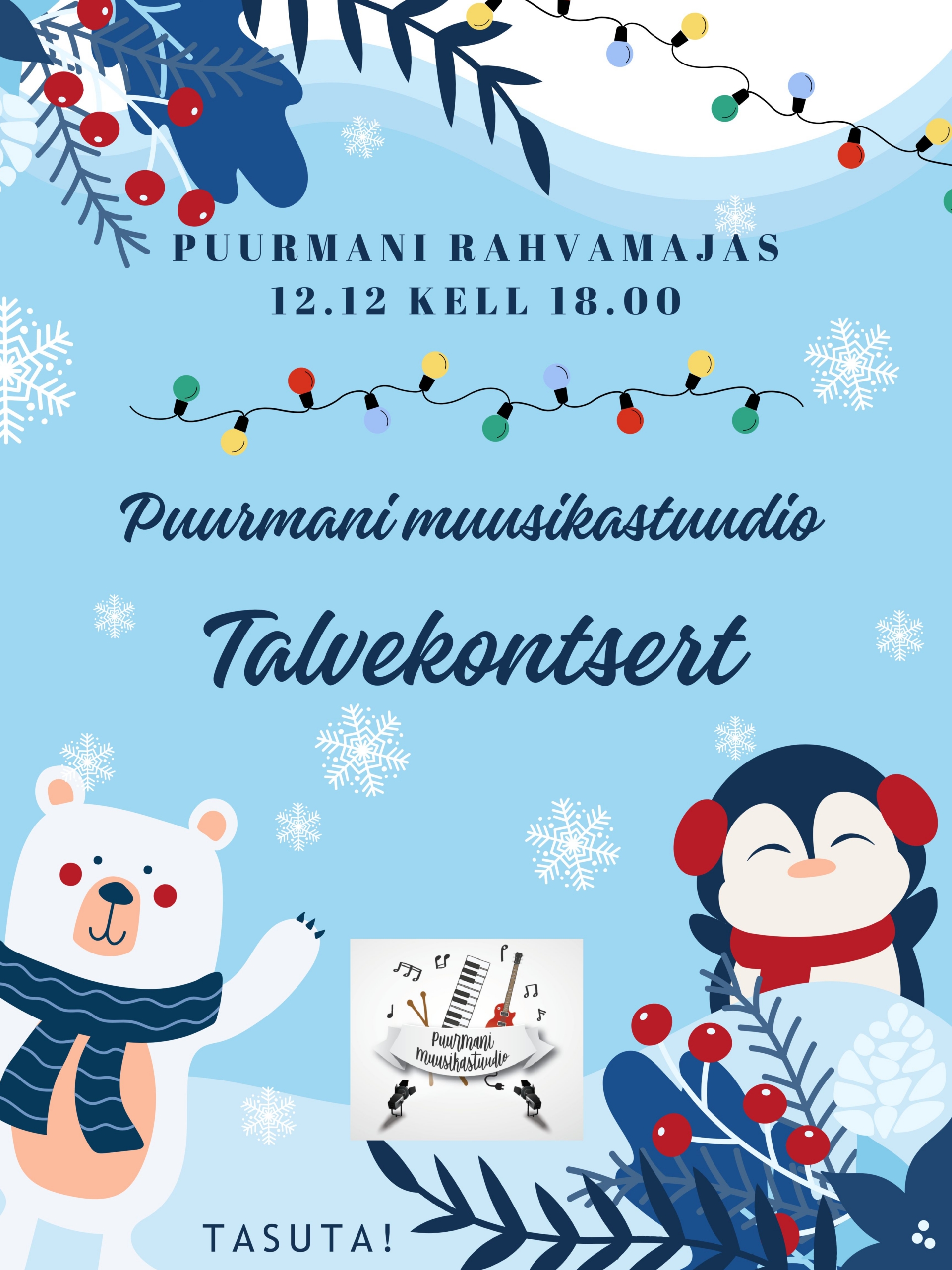 Puurmani Muusikastuudio Talvekontsert 12.12.2025 kell 18.00 Puurmani Muusikastuudio Talvekontsert Puurmani muusikastuudio võtab oma sügishooaja kokku meeleoluka Talvekontserdiga. Ootame kuulama! 00 päeva 00 tundi 00 minutit 00 sekundit Kuupäev 12 dets. 2025 Aeg 18:00 - 20:00 Jaga