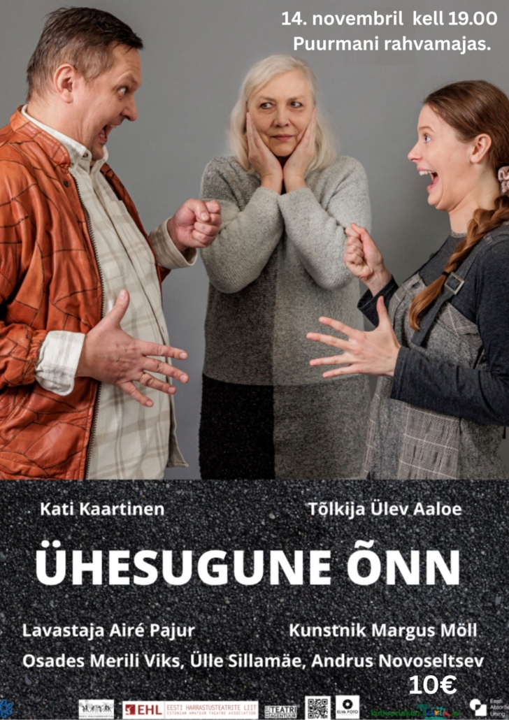 LendTeater “Ühesugune õnn” 14.11.2025 kell 19.00 LendTeater "Ühesugune õnn" Pilet 10.- Soe ja südamlik lugu ... 14 nov. 19:00 - 20:45