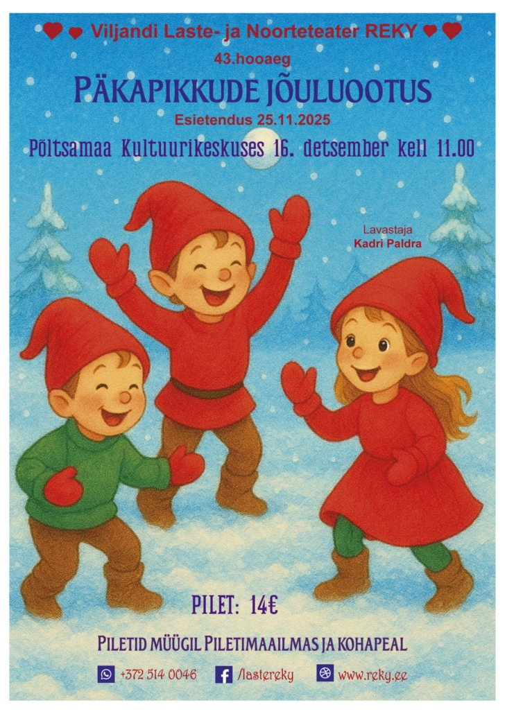 Viljandi Laste- ja Noorteteater REKY “Päkkapikkude jõuluootus” Põltsamaa Kultuurikeskuses 16. detsember kell 11.00 Pilet 14.- (piletid müügil Piletimaailmas ... 16 dets. 11:00 - 13:00