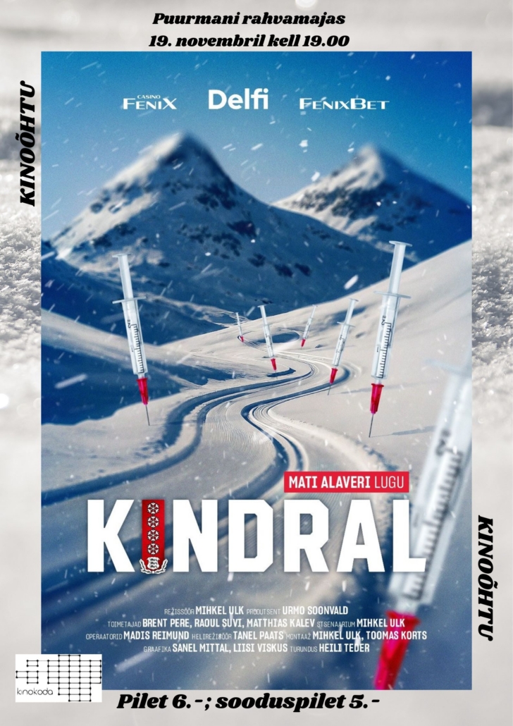 Kinokolmapäev “Kindral” 19.11.2025 kell 19.00 kinokolmapäev "Kindral" Pilet 6.-; sooduspilet 5.- Portree treener Mati ... 19 nov. 19:00 - 21:00
